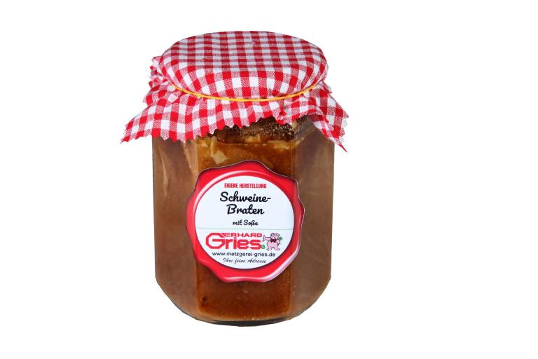 Zutaten: Schweinefleisch 55%, Speisesalz, Pfeffer, Muskat, Soße (Brühe (Trinkwasser, Schweineknochen, Karotten, Sellerie, Lauch, Zwiebeln, Schweineschmalz), Salz, Pfeffer, Muskat, Weizenmehl, Palmfett, Karamellzucker)
