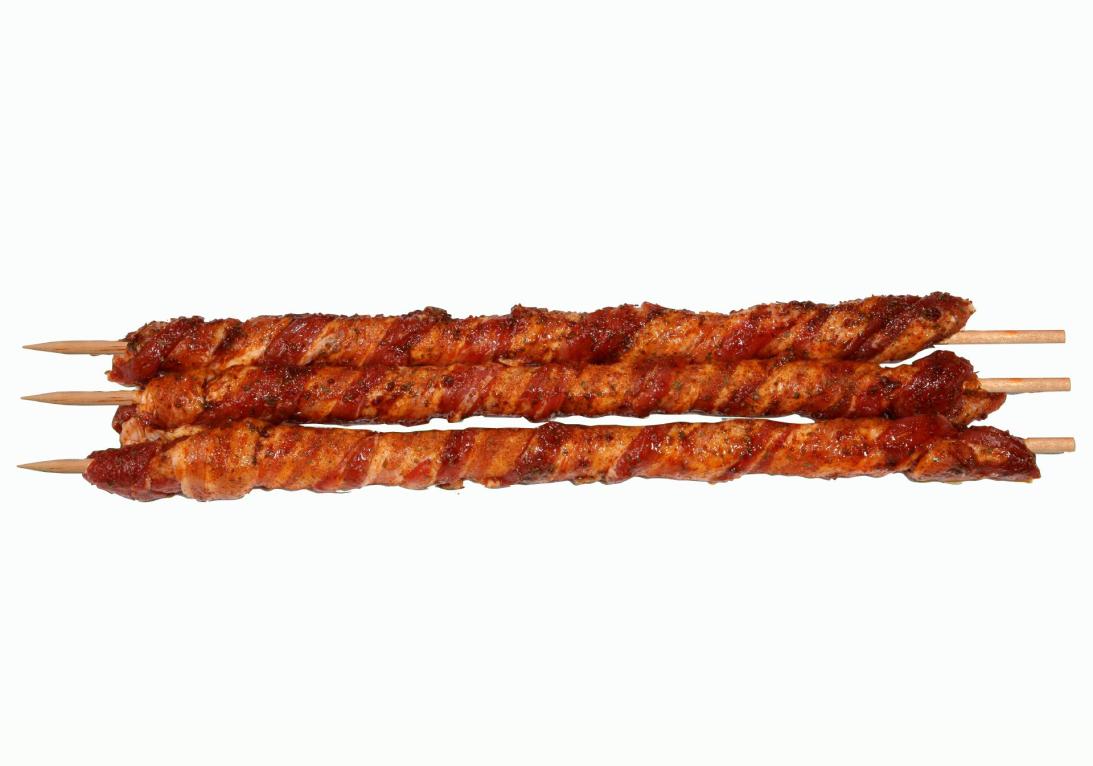 Ein Holzspeil, umwickelt mit dünn aufgeschnittenem Schweinebauch, herzhaft abgewürzt, knuspriggegrillt ..mmh .